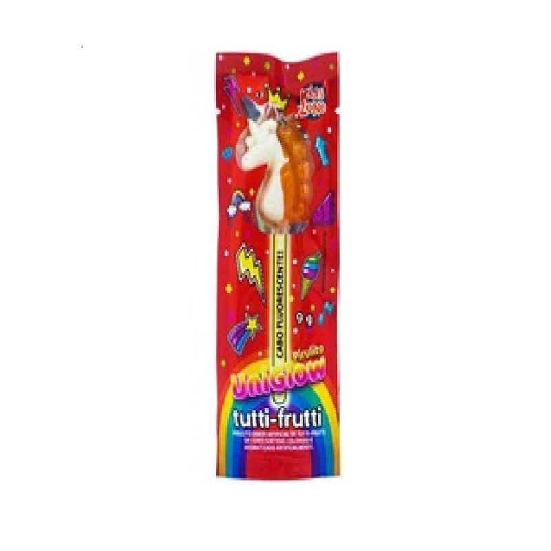 1076-KIDSZONE-KIDS UNIGLOW-PIRULITO CABO FLUORESCENTE PIRULITO KIDS ZONE UNIGLOW 9G; Pirulito kids neon pop uniglow com cabo fluorescente sabor artificial de Tutti-Frutti colorido e aromatizado artificialmente. ESPECIFICAÇÕES: Marca: Kids zone; Peso: 9g.
