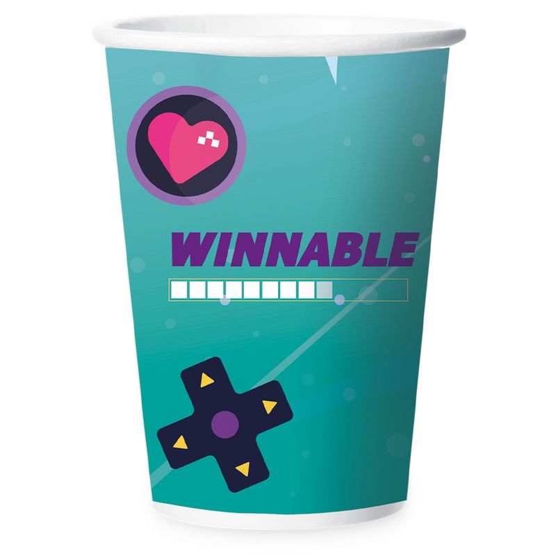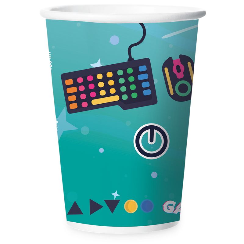 Na Fantasia kids você encontra o tema Games, utilize os Copos de papel tema Festa Games, na hora servir seus convidados, os Copos festa Games pode compor a decoração da mesa, uma dica é dar de lembrancinha com doces, embrulhado no plástico transparente e fita.