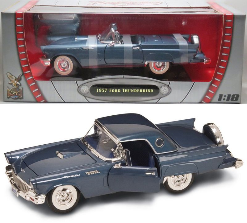 1957 Ford ThunderbirdMarca do produto: Yat Ming.Coleção: Road Signature CollectionEscala: 1/18 (aproximadamente 26,5 cm de comprimento).Pneus de Borracha.Acompanha base expositora.Abre portas, capô e porta malas. Possui teto removível.Rodas esterçam (volante acompanha movimento das rodas).Miniatura em Metal com partes de plástico.