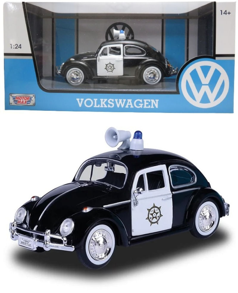 1966 Volkswagen Beetle PoliceMarca do produto: Motormax.Escala: 1/24 (aproximadamente 17 cm de comprimento).Pneus de Borracha.Abre as Porta e Tampa do Motor Traseira.Miniatura em Metal com partes de plástico.