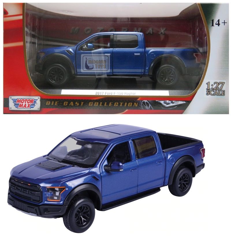2017 Ford F-150 RaptorMarca do produto: Motormax.Escala: 1/24 (aproximadamente 21,5 cm de comprimento).Pneus de Borracha.Abre as Portas.Acompanha base expositora.Miniatura em Metal com partes de plástico.