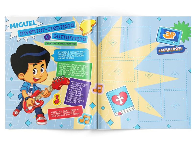 Vem aí uma linda surpresa para os fãs de Sarah, Davi e Miguel, a turminha do 3 Palavrinhas: a parceria do canal com a Panini vai trazer o livro ilustrado oficial desse trio musical tão amado! O álbum é uma forma divertida de colecionar figurinhas e relembrar, em família, os grandes sucessos de cada um dos 10 álbuns musicais do grupo. Junto dos três amigos, os leitores vão embarcar em uma viagem no tempo, que conta mais sobre essa trajetória sensacional. O livro ilustrado traz também as letras das músicas mais queridas, para a família inteira cantar junto! Essa coleção é formada por 192 cromos, sendo 48 deles especiais, e um pôster exclusivo.