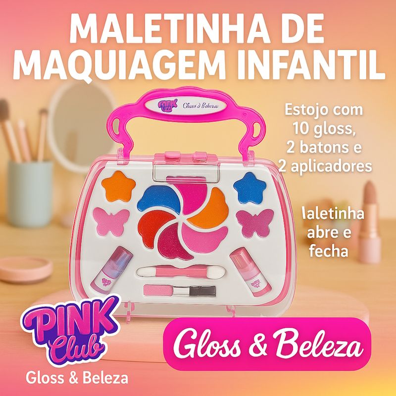 A diversão está garantida com a Maletinha de Maquiagem Infantil Pink Club! Perfeita para meninas que adoram se maquiar como a mamãe. O kit vem com 10 gloss, 2 batons e 2 aplicadores em uma maletinha charmosa que abre e fecha com facilidade. Produzida com materiais atóxicos e seguros, estimula a criatividade, coordenação motora e imaginação das crianças. Ideal para presentes, lembrancinhas de festas e brincadeiras entre amigas.