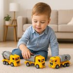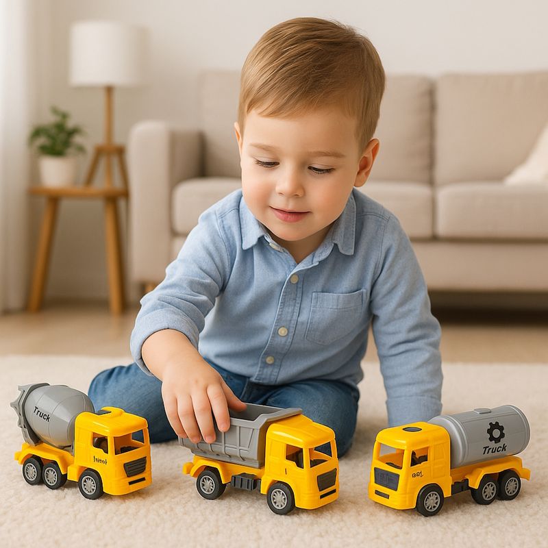 - Kit com 4 Caminhões Diferentes: Inclui betoneira, escavadeira, caçamba e caminhão tanque — ideal para brincadeiras criativas de construção.
