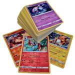 O lote contém 50 cartas Pokémon, incluindo uma seleção de Comuns, Incomuns, Energia e Treinadores, com 2 cartas brilhantes (holo ou reverse foil).