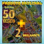 O lote com 50 Cartas Pokemon inclui cartas Comuns/Incomuns/Energia/Treinadores e 2 brilhantes (holo ou reverse foil)