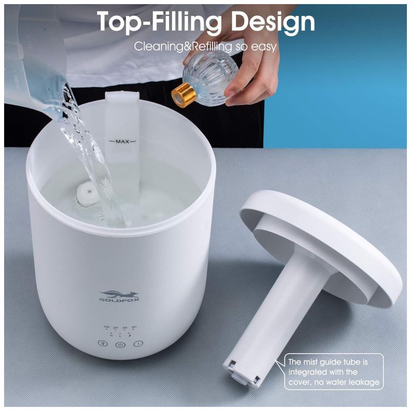 Tanque de Água de Enchimento Superior Este umidificador difusor é de ampla abertura que facilita o reabastecimento e a limpeza com todas as peças incluindo a tampa destacável para manter a higiene e segurança. A tampa do umidificador e o tubo guia de névoa são formados em uma única peça. Comparado com o design integrado do tubo guia de névoa e do tanque de água, não haverá vazamento mesmo após uso prolongado.