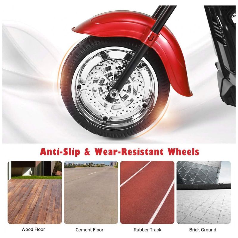 Ande livremente em ambientes internos ou externos As rodas resistentes ao desgaste permitem que seus filhos andem em diferentes tipos de terreno, como estrada de tijolos, piso de madeira, piso de asfalto, pista de plástico e muito mais. Desta forma, quase sem limitação de espaço, seja interno ou externo, as crianças devem aproveitar seu tempo de condução feliz livremente