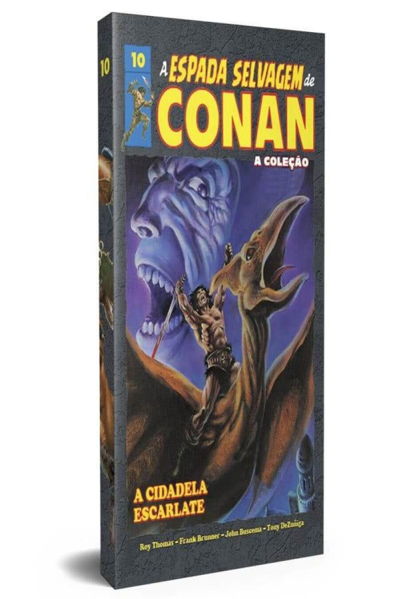 Coroado rei da poderosa Aquilônia, Conan enfrenta a ameaça mortal do mago Tsotha-Lanti num dos contos mais famosos de Robert E. Howard, adaptado por Roy Thomas e Frank ´Doutor Estranho´ Brunner: A Cidadela Escarlate. Em A Lâmina de Fogo, adaptação de uma história escrita por Howard e L. Sprague de Camp , o cimério terá de encarar um velho inimigo em meio a ruínas ancestrais... para combater um culto tão velho quanto o tempo e maligno como Erlik. Por Roy Thomas, John Buscema e Tony DeZuñiga.