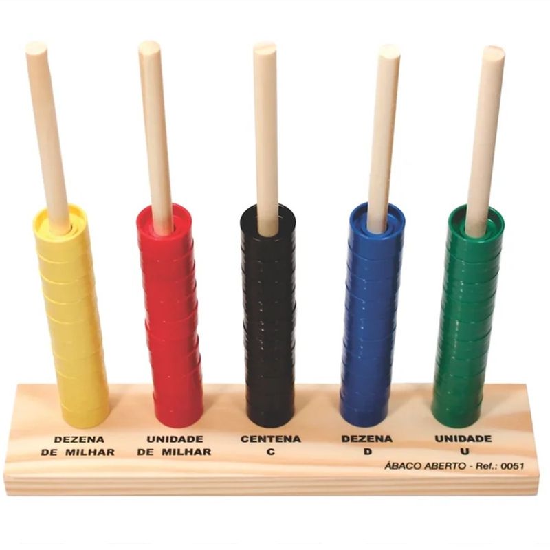 O Ábaco Aberto é um brinquedo educativo que ensina as crianças sobre a classe, a ordem numérica e como realizar operações matemáticas. Ele é composto por uma base e 5 colunas em madeira e 50 argolas coloridas em plástico, representadas da seguinte forma: verde (unidade), azul (dezena), preto (centena), vermelho (unidade de milhar) e amarelo (dezena de milhar).