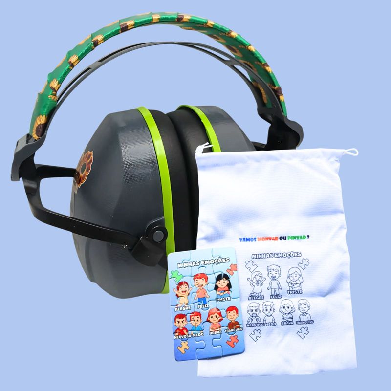 Descubra o Abafador de Ruídos Sunflower Green, ideal para pessoas atípicas que buscam conforto e proteção auditiva eficaz. Com redução de ruído de até 26 dB, proporciona um ambiente mais tranquilo para concentração, relaxamento ou estudos. Seu design ergonômico com acolchoamento macio garante uso prolongado sem desconforto, enquanto o acabamento do arco com a estampa de girassol traz um toque de leveza e personalidade. O produto acompanha um jogo de quebra-cabeça e a arte do quebra-cabeça estampada no saquinho para colorir, estimulando o raciocínio e a concentração de forma divertida e terapêutica.
