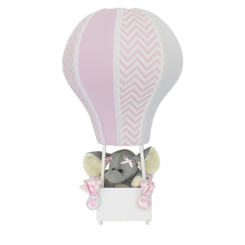 O Abajur Balãozinho é feito com armação de arame galvanizado, acetato forrado em tecido e a cestinha em madeira com elefante.