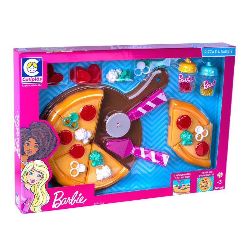 A Pizza da Barbie é a brincadeira de comidinha comum entre várias crianças de diferentes lugares, sendo um dos primeiros caminhos que entram no mundo da brincadeira simbólica. Nesses momentos, dar asas a imaginação e entrar na brincadeira com as crianças é uma oportunidade de vínculos afetivo. Nesse sentido a comida se torna um agregador nos lares. A Pizza da Barbie acompanha diversos ingredientes como tomate, brócolis, azeitonas pretas em rodelas e muito mais. Ela ainda acompanha espátula para servir e cortador (não cortante). Você vai precisar de muita imaginação e criatividade para criar uma pizza deliciosa. Acompanha também adesivos customizados da Barbie para deixar tudo ainda mais encantador.