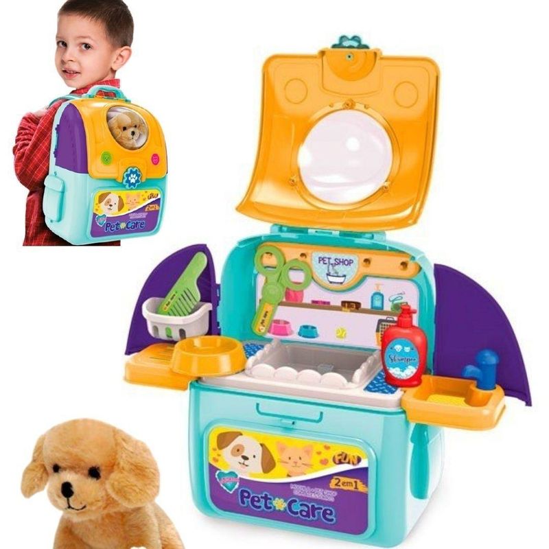 kit 2 em 1: Mochila e Petshop. Vem com Vários Acessórios. Tudo Pode Ser Carregado Para Qualquer Lugar Dentro da Mochilinha! 01 pet, 01 mochila com alças para transporte, 01 pote de ração, 02 caixas de ração, 01 pente, 01 secador, 01 tesoura, 01 suporte para pendurar utensílios, 01 pia com torneira, 01 extensor de pia, 01 cartela de adesivos, 01 cesta para pendurar, 01 frasco de shampoo e 01 base para pet