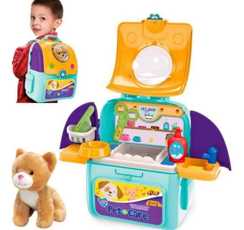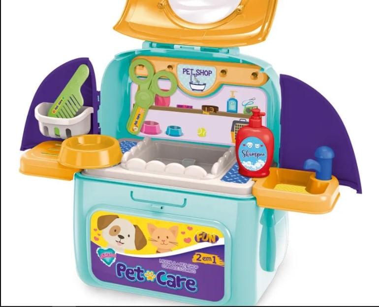 kit 2 em 1: Mochila e Petshop. Vem com Vários Acessórios. Tudo Pode Ser Carregado Para Qualquer Lugar Dentro da Mochilinha! 01 pet, 01 mochila com alças para transporte, 01 pote de ração, 02 caixas de ração, 01 pente, 01 secador, 01 tesoura, 01 suporte para pendurar utensílios, 01 pia com torneira, 01 extensor de pia, 01 cartela de adesivos, 01 cesta para pendurar, 01 frasco de shampoo e 01 base para pet
