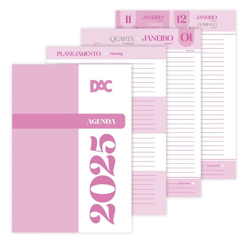 CARACTERÍSTICAS DO PRODUTO Marca: DAC Comprimento x Altura x Largura: Produto - 134mm x 190mm x 15mm Comprimento x Altura x Largura: Embalagem - 164mm x 220mm x 45mm Indicação de idade: +4 anos Material: Capa em PVC Peso: 400g Cor: Rosa, Verde, Roxo, Branco, Cinza Sku: 4555DAC Ean: 7908689912016 Detalhes: - Tamanho Colegial A5; - 336 folhas; - Gramatura das folhas de 60g/m²; - Folhas datadas; - Datas do ano de 2025; - Contém marca-página. Instrução de uso e cuidados. Uso: Anote compromissos e tarefas diárias. Defina prioridades com cores ou símbolos. Revise suas tarefas semanalmente. Use para registrar metas e ideias. Cuidados: Proteja a capa, evitando contato com líquidos. Armazene em local seco e longe do sol. Evite dobrar ou amassar as páginas. Manuseie com cuidado para preservar a encadernação. Resumo do produto: Agenda diária com material de toque macio para acompanhar o ano de 2025 e não perder nada.
