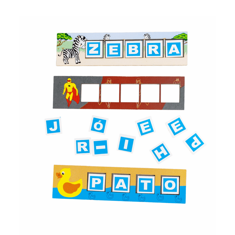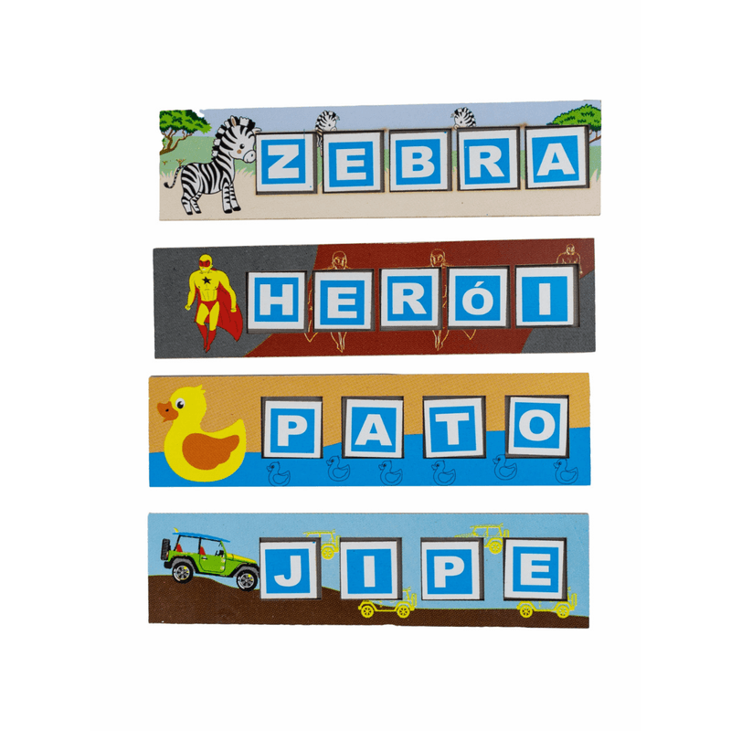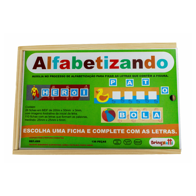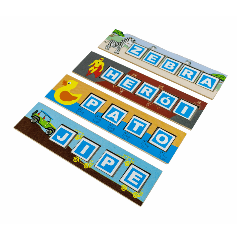 O brinquedo auxilia no processo de alfabetização para fixar as letras que contém a figura, tem como principal objetivo, aprender conceitos de alfabetização e formação de palavras de acordo com a imagem, a criança deve escolher uma ficha e completar as letras para formar a palavra, ja aproveitando para trabalhar o som de cada letra e em seguida fazer tentativas de leitura. Feito em madeira, este brinquedo educativo trabalha também o aprendizado das letras para leitura e escrita, desenvolvimento do vocabulário, identificação de silabas, conhecimento das letras e descriminação visual.