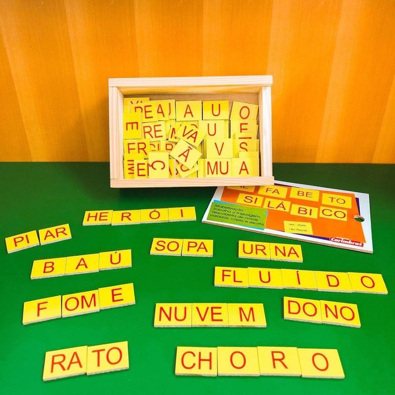 Brinquedo pedagógico que auxilia a alfabetização e a criação de palavras.