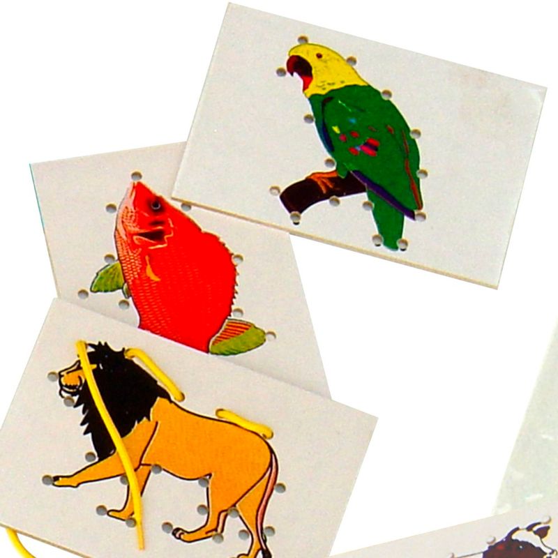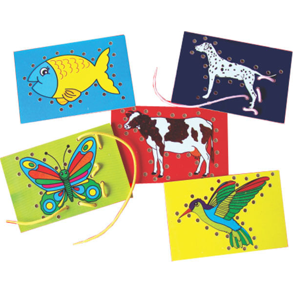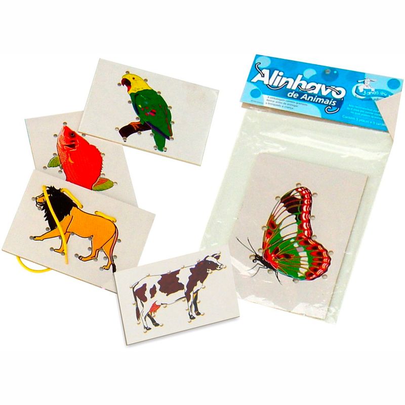 Conjunto de alinhavos com desenhos de animais para estimular a coordenação motora e ao mesmo tempo divertir, possui 05 peças medindo 15 x 10 x 0,3 cm e 05 cordões coloridos.