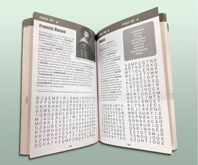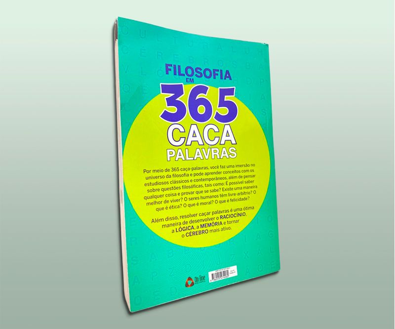 Por meio de 365 caça-palavras, você faz uma imersão no universo da filosofia e pode aprender conceitos com os estudiosos clássicos e contemporâneos, além de pensar sobre questões filosóficas, tais como: É possível saber qualquer coisa e provar que se sabe? Existe uma maneira melhor de viver? O seres humanos têm livre-arbítrio? O que é ética? O que é moral? O que é felicidade?