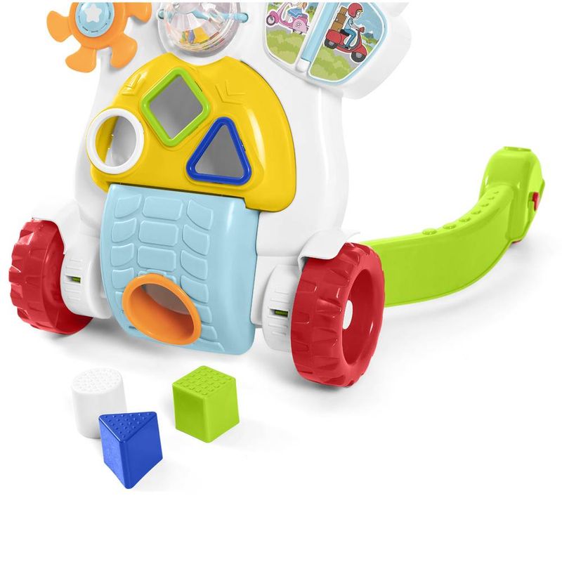 Brinquedo 2 em 1 com design inspirado em uma motocicleta. É um andador e um centro de atividades que encanta com seus detalhes. Os relevos lembram as garras de um pneu, as luzes que acendem ao acionar o som e simulam um farol. O painel didático possui diversas interações, como pecinha para girar com barulhinho de ?creck-creck?, e peças de encaixar. Estimula a percepção auditiva e visual com luzes e sons divertidos.