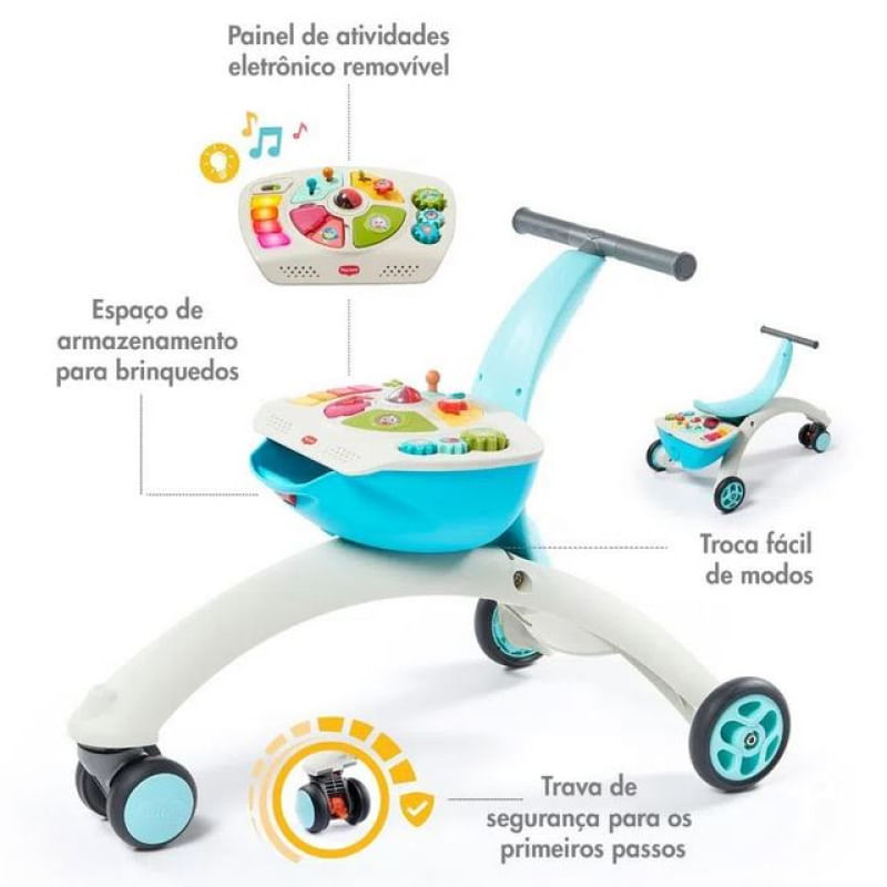 5 funções: brincar, caminhar, empurrar, ficar em pé e sentar. Versátil, cresce com o seu bebê. Repleto de recursos para o desenvolvimento cognitivo e motor.