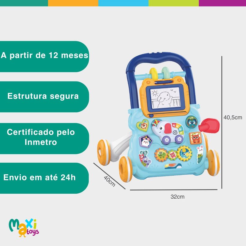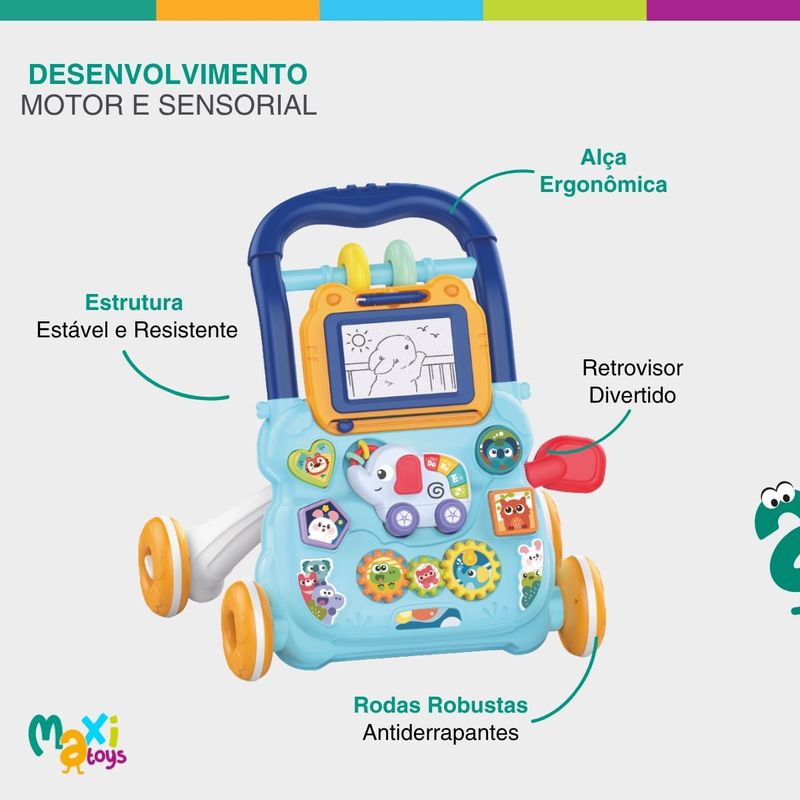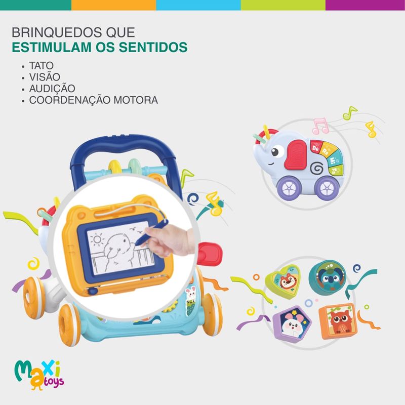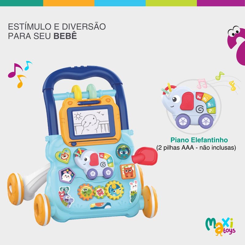Andador Infantil de Empurrar Brinquedo Educativo e Didático com Teclado Musical e Lousa Mágica Elefante - Maxi Baby