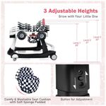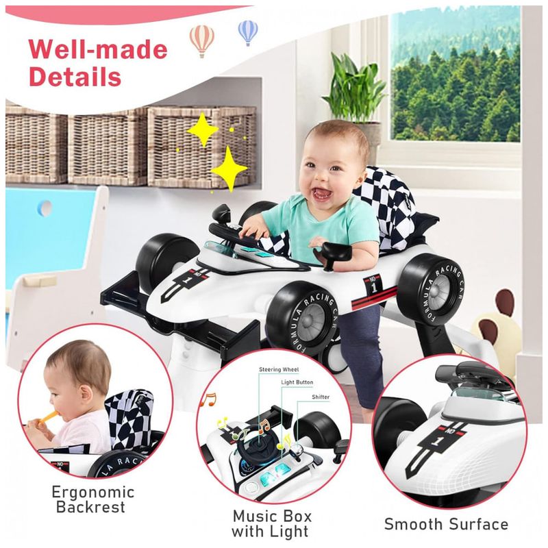 Design interativo Com um volante, um câmbio, 2 botões de luz com luzes diferentes e 2 espelhos de brinquedo com vista traseira, este andador simula a aparência de um carro de corrida, satisfazendo a curiosidade do seu filho por explorar e aprender cedo. E a música torna a diversão ainda mais longa. Requer 2 pilhas AA não incluídas .