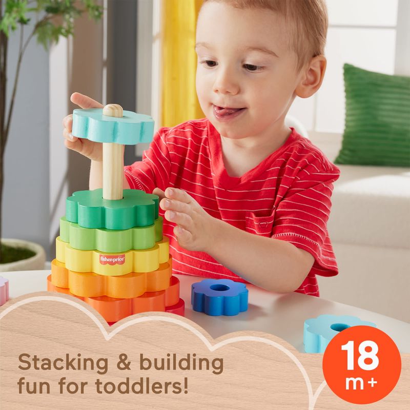 Anéis Empilháveis de Madeira Marca: Fisher-Price - Mattel Idade Recomendada: Maiores de 18 meses. O brinquedo de empilhar anéis de madeira da Fisher-Price é uma versão moderna de um clássico brinquedo de empilhar. As crianças vão adorar separar, empilhar e girar os anéis coloridos e fáceis de segurar, com formato ondulado, na base de madeira. Feito com madeira proveniente de florestas certificadas pelo FSC e com manejo sustentável, este brinquedo é uma maneira divertida de ajudar as crianças a desenvolverem a coordenação motora fina enquanto brincam. (FSC C130462, 2022)