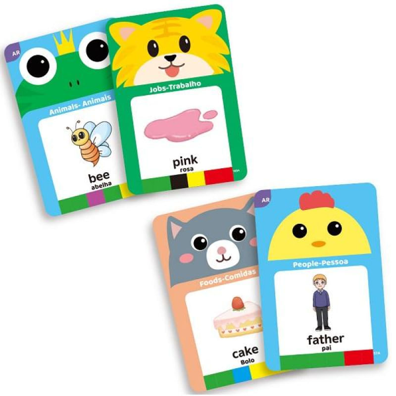 Vem com 112 cards para aprender cores, países, formas, animais, entre outras palavras em inglês.