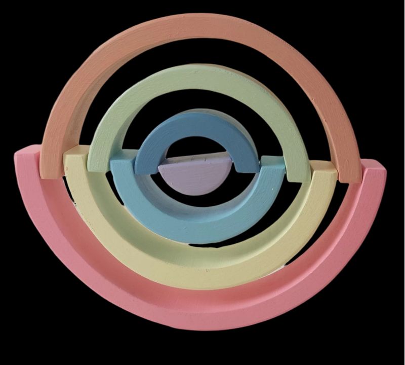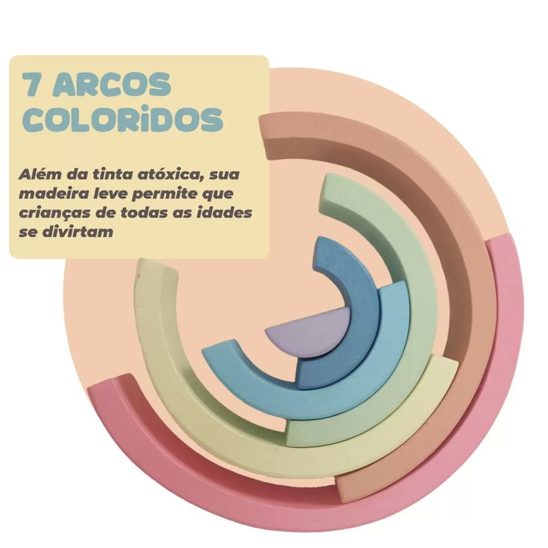 Brinquedo em formato de arco-íris, contendo sete peças coloridas. Confeccionado artesanalmente em madeira de reflorestamento e pintado com tinta atóxica. Possibilidade de equilibrar e montar em outros formatos, incentivando a criatividade e imaginação. Pode ser usado também como peça de decoração.