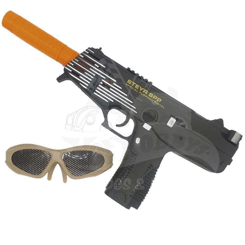 Com um óculos de proteção, você está protegido e abastecido para enfrentar os seus adversários. Quando é apertado o gatilho, ela emite som, luz e treme dando a impressão de realidade.