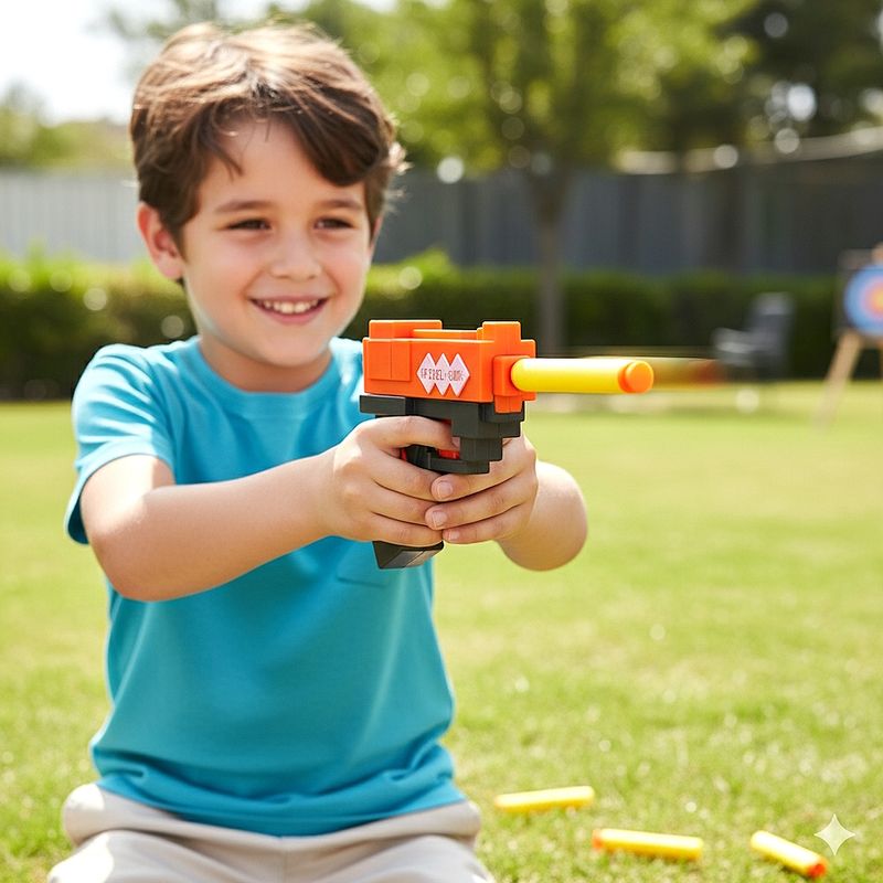 Divirta as crianças com o Lança Dardos Pixel Gun, inspirado no universo pixelado que elas amam. Cada lançador vem com 5 dardos de espuma com ventosa, macios e seguros. Modo de uso: puxe para trás para engatilhar, coloque o dardo, mire e dispare. Ideal para quintal, parque e festas, estimula coordenação motora, mira e imaginação em aventuras no “mundo dos pixels”.