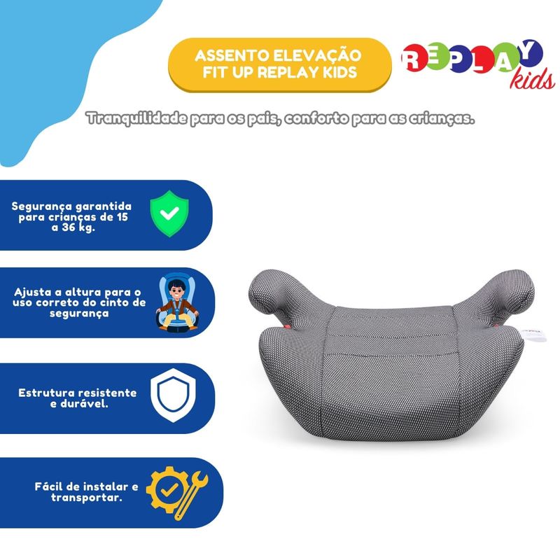 Assento de Carro Infantil Elevação Fit Up Cinza Replay Kids O Assento De Carro Infantil Elevação Fit Up Cinza da Replay Kids é a escolha ideal para proporcionar mais segurança e conforto às crianças durante viagens de carro. Projetado para elevá-las à altura ideal, garante o ajuste correto do cinto de segurança de três pontos, oferecendo maior proteção. Leve e prático, é fácil de transportar e instalar, tornando o dia a dia dos pais mais simples. Protege o assento do veículo enquanto proporciona maciez extra para o pequeno passageiro. Seus apoios para os braços oferecem ainda mais conforto, e a capa removível e lavável facilita a higienização. Com o Booster Turbo, segurança e praticidade andam juntas, sempre com a qualidade Replay Kids! Certificado pelo INMETRO, oferece a garantia de padrões de segurança confiáveis para os pequenos passageiros, o que o torna uma escolha popular entre os pais conscientes da segurança de seus filhos. Principais Características: