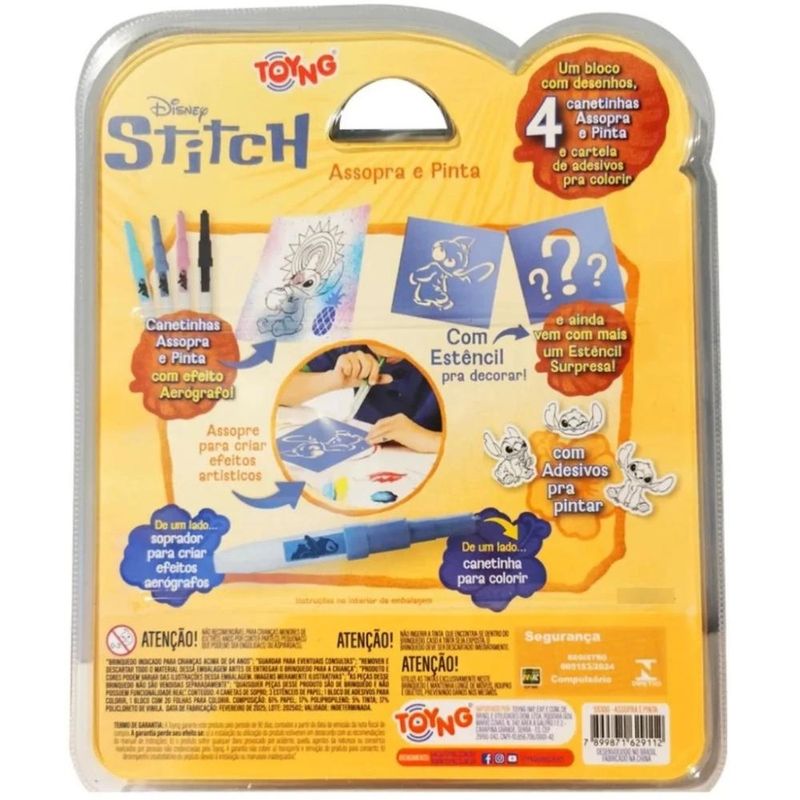 O Assopra e Pinta Para Colorir Disney Stitch é um kit criativo e divertido que traz o personagem mais travesso e querido da Disney para as brincadeiras das crianças. Composto por canetas de sopro, estênceis e blocos para colorir, o conjunto permite criar efeitos únicos e desenhos personalizados de forma lúdica e interativa.Além de estimular a imaginação, o kit ajuda no desenvolvimento da coordenação motora e da concentração, tornando o aprendizado ainda mais divertido. Compacto e fácil de usar, é ideal para momentos de lazer em casa ou na escola.\n\nIdade recomendada:2-4 anos;Composição/Material:Plástico;Funciona com pilhas:Não;Brinquedo com luz:Não;Brinquedo com som:Não;Dimensões:24,7x20x5 cm;Peso:0,356 kg;Código de Barras:7898631593004;Garantia do Fornecedor:3 Meses contra defeito de fabricação;