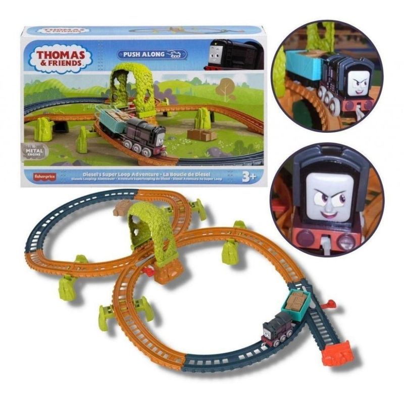 Os maquinistas em idade pré-escolar podem criar aventuras de empurrar de Thomas e seus Amigos com este conjunto de trilhos de 21 peças, incluindo 1 locomotiva die-cast Diesel, vagão de carga, engradado de carga e um circuito completo de trilho no formato de 8
