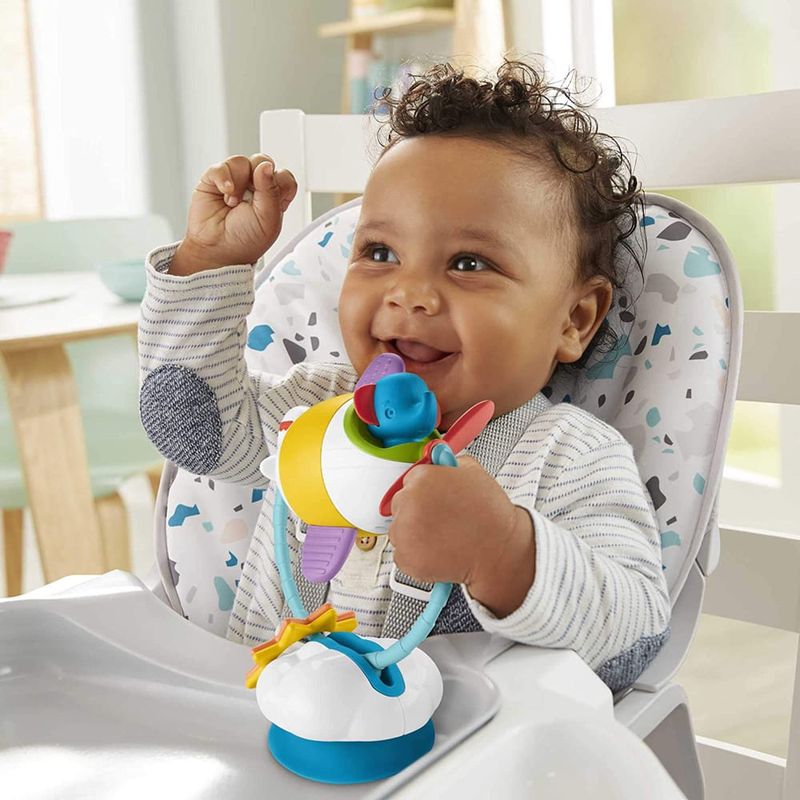 O avião de atividade acopla-se facilmente à bandeja do cadeirão do bebê com uma forte ventosa e possui asas de mordedor em borracha e um girador de hélice.