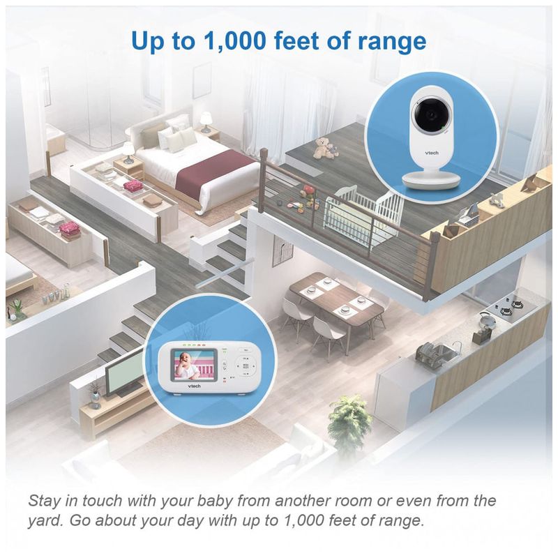 Tecnologia de transmissão segura de longo alcance não é necessário Wi Fi ou emparelhamento de aplicativos Com a confiança das famílias dos EUA há mais de 3 décadas, os monitores VTech usam a tecnologia FHSS em canal de 2,4 Ghz para se comunicar com a câmera, criando uma rede segura e de longo alcance com até alcance de 90 m2. Isso permite que apenas você fique de olho em seu bebê de qualquer lugar da casa ou até mesmo do seu quintal.