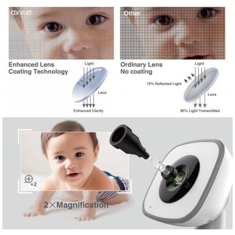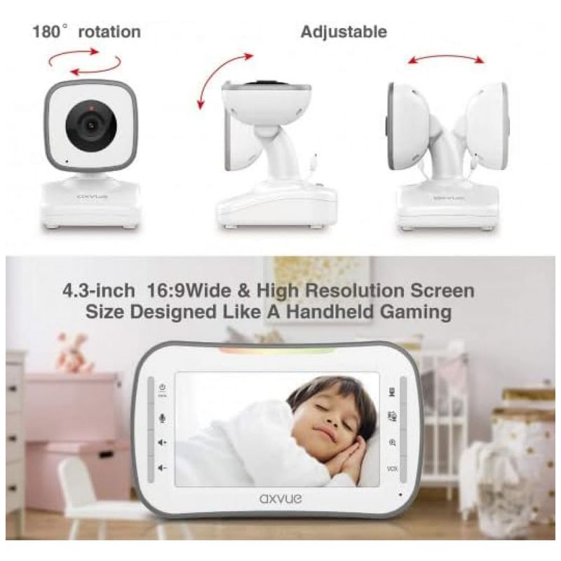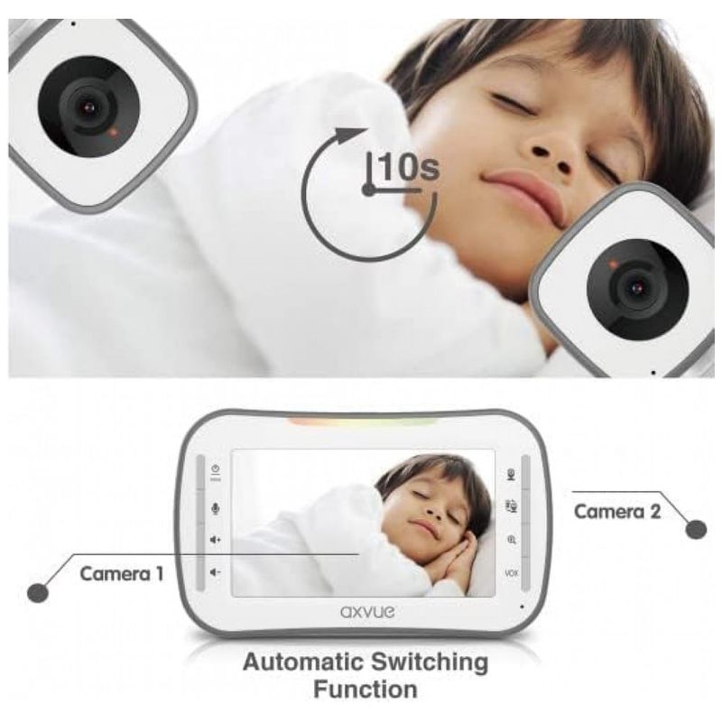 DUAS CAMERAS PARA DOIS QUARTOS O monitor é emparelhado com duas câmeras antes de chegar até você. Mude para a câmera o que quiser. A tela pode ser configurada para alternar automaticamente por 10 segundos.