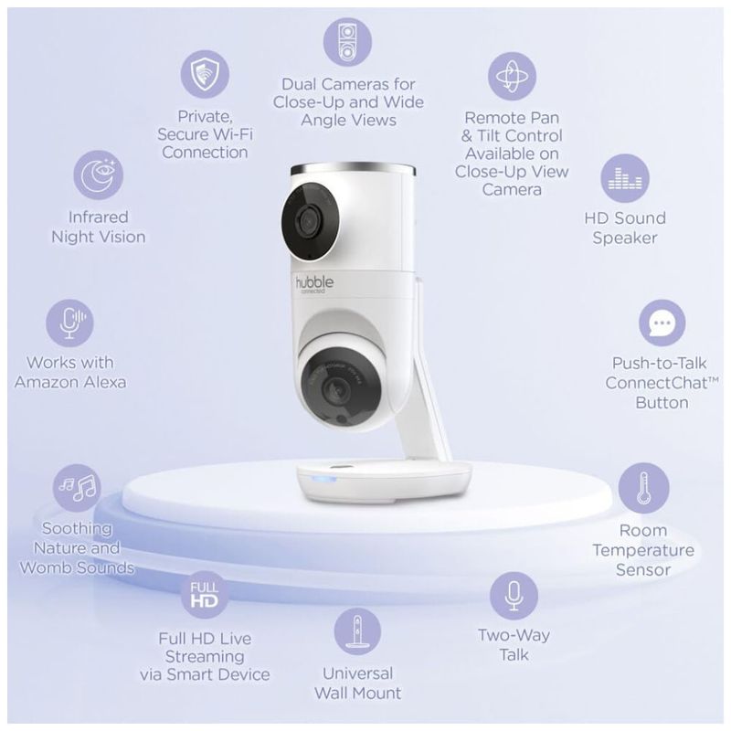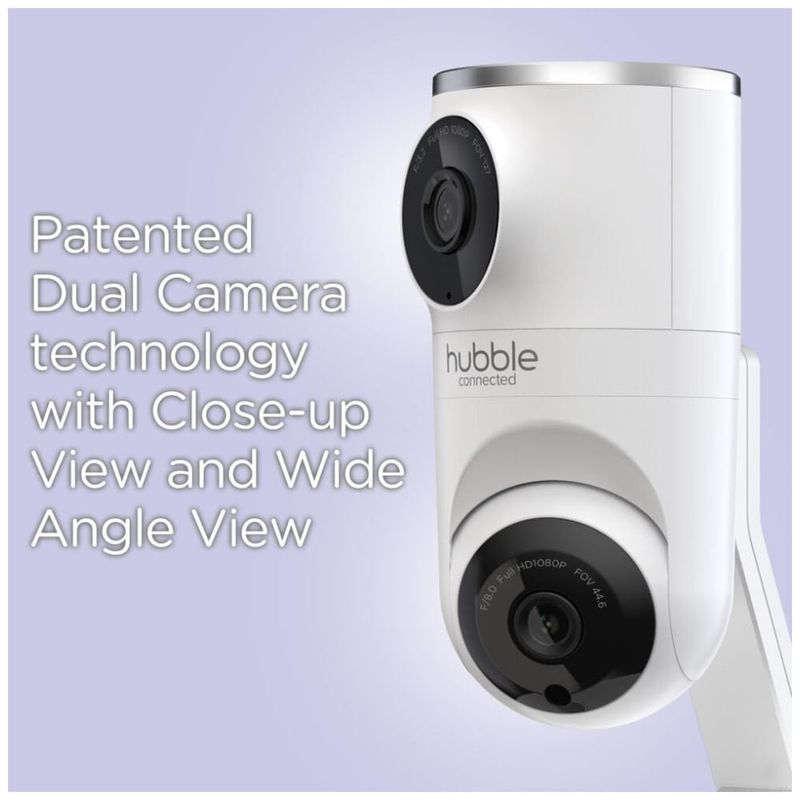 A câmera de monitoramento inteligente Nursery Pal Dual Vision da Hubble Connecteds oferece aos pais uma perspectiva totalmente nova ao monitorar seus bebês. É a única unidade de monitoramento no mercado que apresenta uma visão grande angular e regular, que fornece simultaneamente uma visão em close e grande angular, juntamente com o rastreamento de movimento de IA, permitindo que os pais tenham uma visão abrangente do bebê e do ambiente.