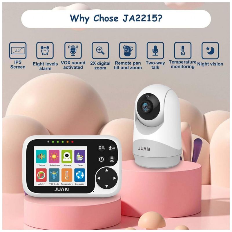 Imagens HD em tempo real O sistema de câmera de monitor de bebê IPS JUAN de 7 centímetros fornece aos usuários uma resolução vívida, mesmo quando você aumenta o zoom em 2X. Qualquer falha ou distorção que você encontrou antes foi eliminada, garantindo a você a visão da mais alta qualidade ao seu redor. Saiba o que aconteceu simplesmente olhando para a tela. Sinais sem fio mais fortes O sistema de monitor de bebê de vídeo JUAN utilizou sinal sem fio de 2,4 GHz, o que aumentou drasticamente a penetração na parede e o alcance sem fio máximo de até 304 metros de cobertura. Ele fornece uma conexão mais robusta em ambientes desafiadores onde a capacidade de penetrar paredes ou outras barreiras. Emparelhamento automático, plug play No monitor de bebê JAUN com câmera e sistema de áudio, basta conectar o monitor da câmera a uma tomada e eles serão emparelhados automaticamente, sem aplicativo, sem criação de conta, sem problemas de instalação, é assim que deve ser sem fio. Você pode adicionar quatro câmeras adicionais com áudio bidirecional para atender às suas necessidades de monitorar mais áreas. Design amigável A lente do monitor da câmera do bebê JUAN gira em 355 e inclina se em 120, dando a você uma visão completa do berçário. Mova a câmera do bebê facilmente através da unidade dos pais. Do pátio à cozinha, tudo sob seu controle. Com suporte para vários idiomas, é mais fácil configurar os monitores de bebê JUAN personalizados em sua língua familiar. Compra sem preocupações. Sinta se à vontade para nos contatar por e mail e mensagem da sempre que quiser, e substituiremos quaisquer produtos defeituosos ou quebrados