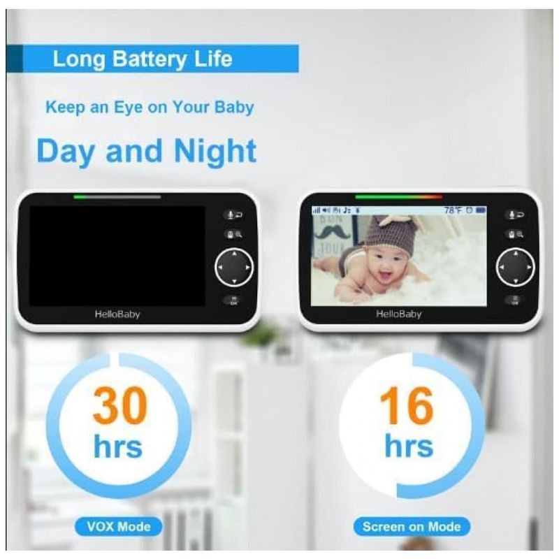 Seja de dia ou de noite, o Monitor de Vídeo HelloBaby proporciona uma visão nítida de todos os detalhes com sua tela IPS de 15 cm, reduzindo a fadiga ocular. Com bateria de incríveis 1630 horas, permite monitorar seu bebê ou ente querido idoso sem luzes fortes, garantindo conforto visual. Com visão noturna infravermelha, áudio bidirecional, controle remoto para rotação de 355 graus, ampla cobertura angular, monitoramento de temperatura do ambiente e alertas, este é o presente ideal para pais de primeira viagem e idosos. Este monitor de bebê sem WiFi oferece conexão estável com tecnologia de criptografia digital, garantindo segurança máxima. Com recursos como detecção de choro, longa duração de bateria, montagem na parede ou mesa, e tela dividida para até 2 câmeras, o HelloBaby proporciona uma experiência de monitoramento completa e segura. Aproveite a praticidade e tranquilidade que o Monitor de Vídeo HelloBaby oferece, seja em casa ou em viagens!