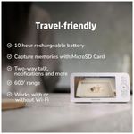 O display para os pais funciona com bateria recarregável e MicroSD para armazenamento de memórias, com áudio bidirecional e alcance de até 180 metros (600 pés). O melhor de tudo, ele não necessita de conexão Wi-Fi, tornando-o ideal para viagens.