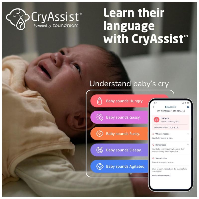 Com o inovador CryAssist da Zoundream, o Pro 360° traduz os choros do seu bebê usando IA, permitindo que você saiba se seu bebê está com sono, irritado, com cólica, agitado ou com fome. Agora você pode responder às necessidades do seu bebê de forma mais rápida e eficaz.