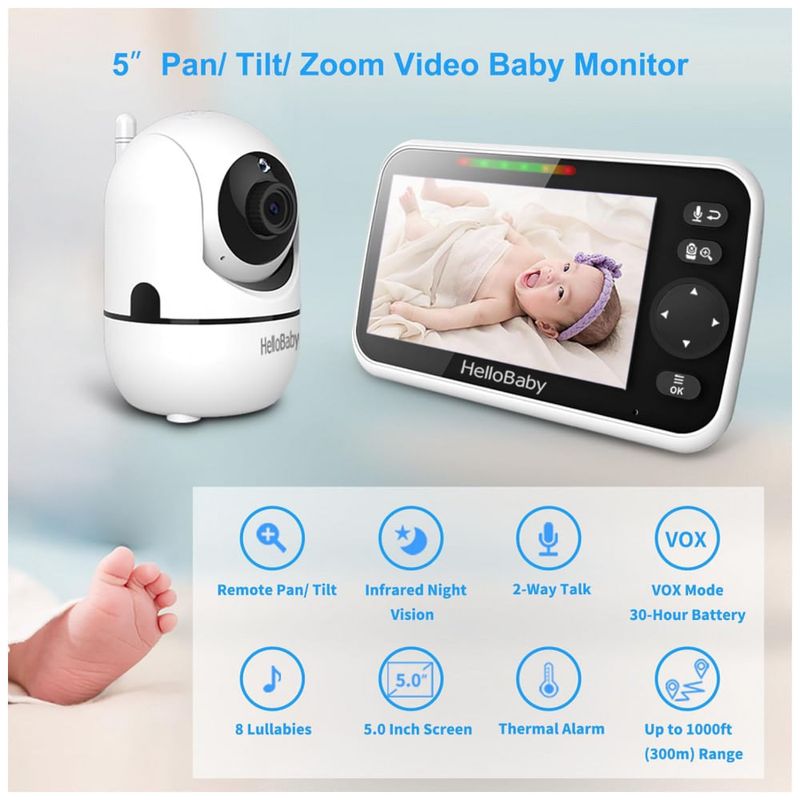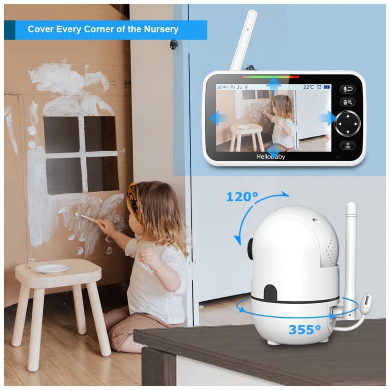MONITOR REMOTO DE 355 PAN e TILT BABY MONITOR COLOR DISPLAY Este monitor de câmera para bebês vem com uma tela grande de 5. A câmera do controle remoto gira 355 na horizontal e 120 na vertical, dando a você uma visão maior do quarto do seu bebê. Também com função de zoom 2X, você pode ver seu bebê com mais clareza.