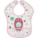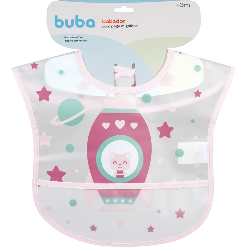 O Babador com Pega Migalhas Foguete da Buba possui tecido impermeavel e bolso pega migalhas, ideal para evitar que o pequeno suje a roupinha. O fecho em velcro se ajusta facilmente ao pescoco do bebe.