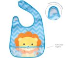 Foi desenvolvido com tecido impermeável e bolso cata-migalhas para maior praticidade na hora da limpeza e proteção do pequeno, pois evita molhar ou sujar a roupinha.