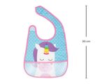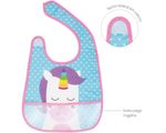 Foi desenvolvido com tecido impermeável e bolso cata-migalhas para maior praticidade na hora da limpeza e proteção do pequeno, pois evita molhar ou sujar a roupinha.