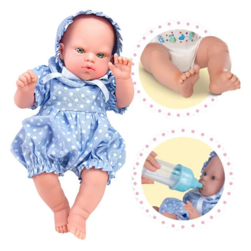 Conteúdo da Embalagem: 01 Boneca, 01 Fralda, 01 Mamadeira e 01 Chupeta.