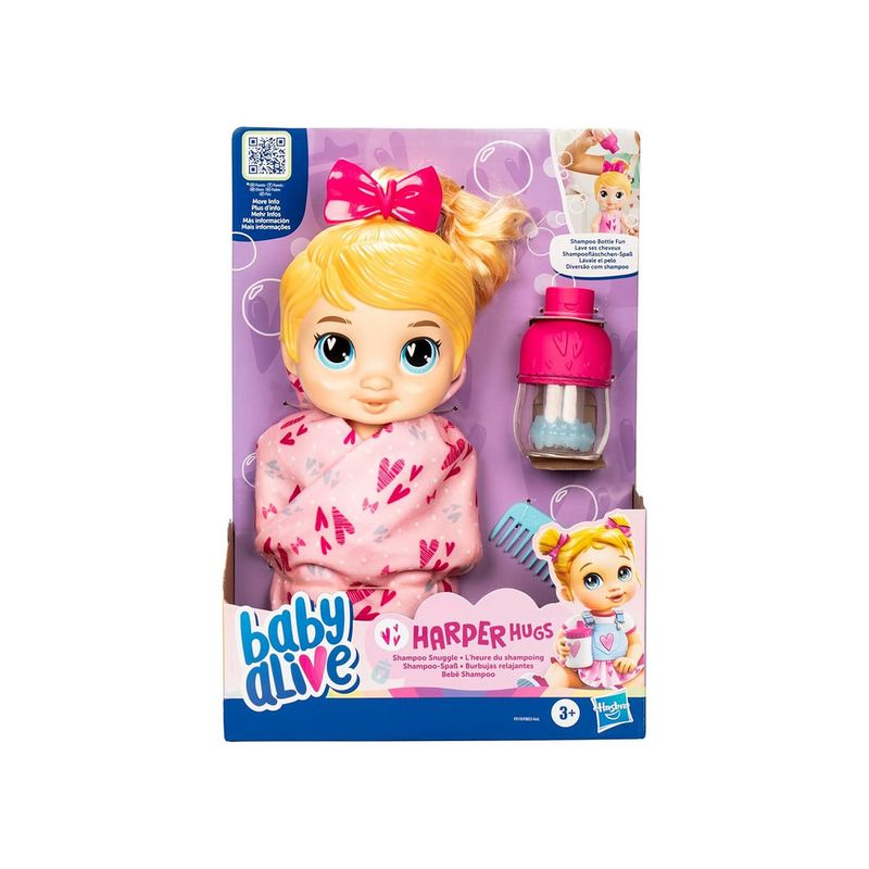 A boneca Baby Alive Bebê Shampoo Harper Hugs da Hasbro traz toda a diversão da hora do banho para as brincadeiras infantis. Com 28 cm de altura e cabelo loiro macio, ela é resistente à água, permitindo que as crianças cuidem, lavem e penteiem seus cabelos de verdade. O conjunto vem com um frasco de shampoo de brinquedo, um pente, um laço removível e uma toalha macia, proporcionando uma experiência completa de cuidado e imaginação.